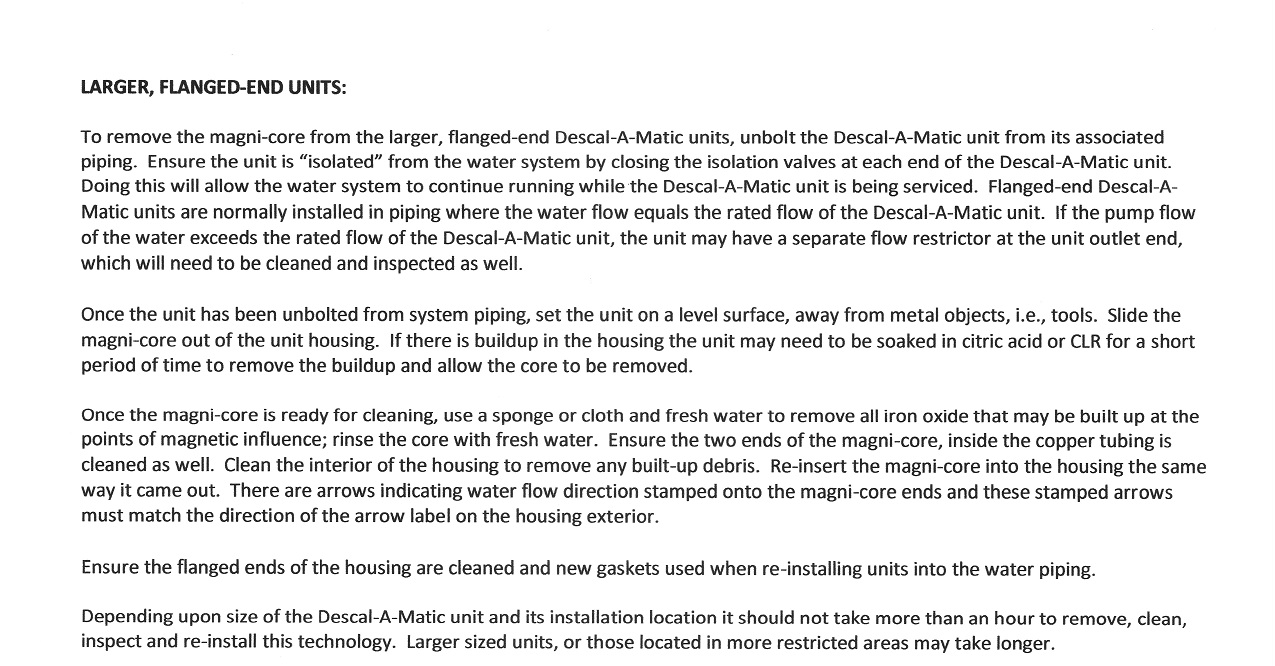 Descal-A-Matic Water Treatment Unit Common Technical Specs: